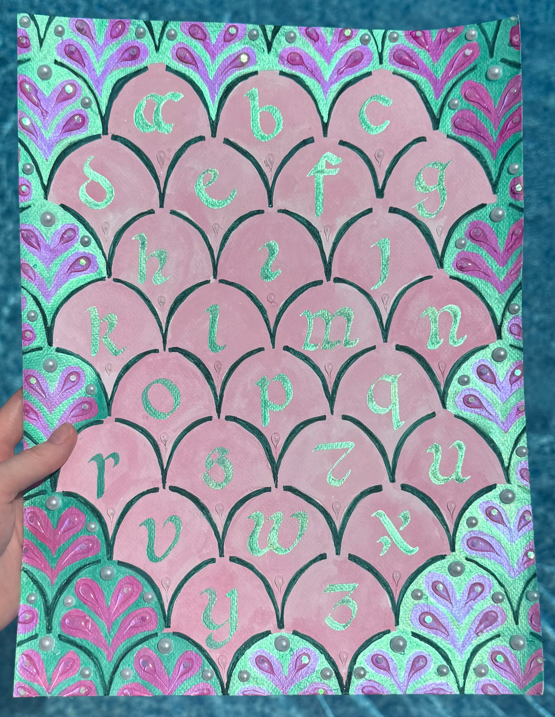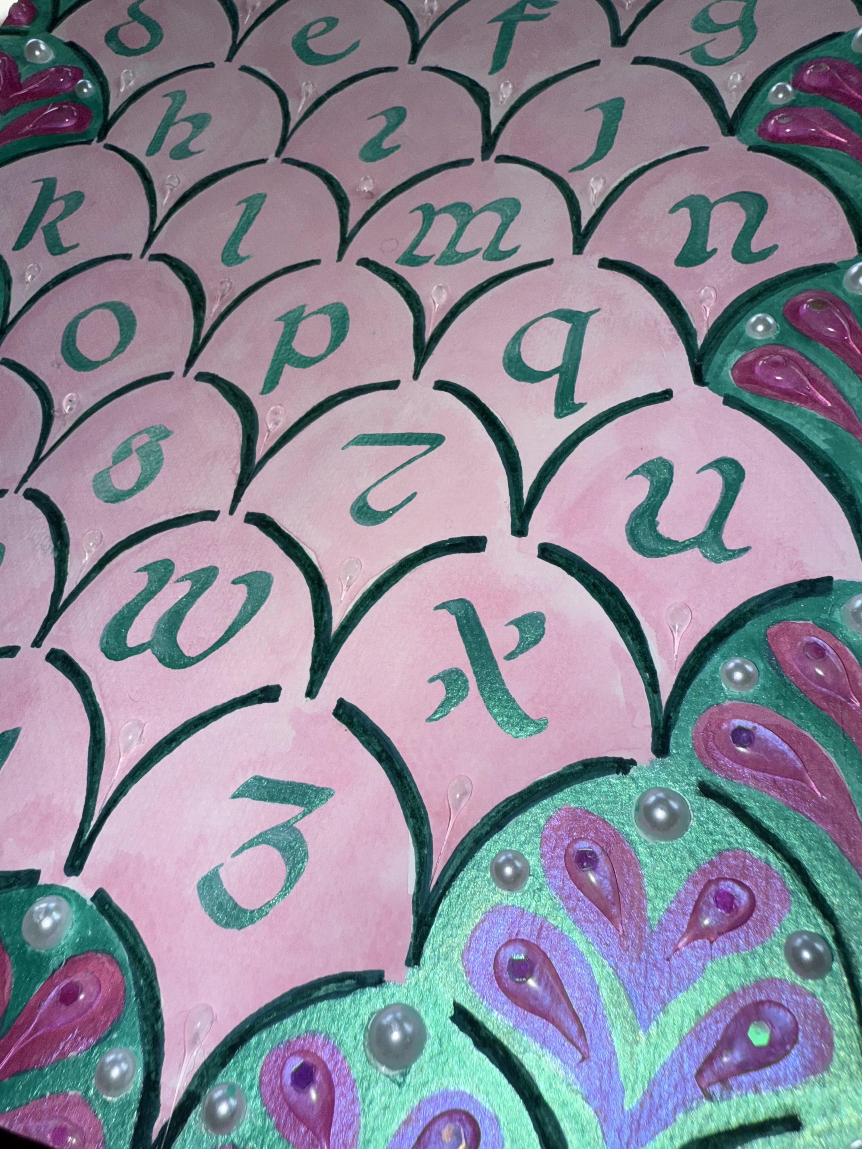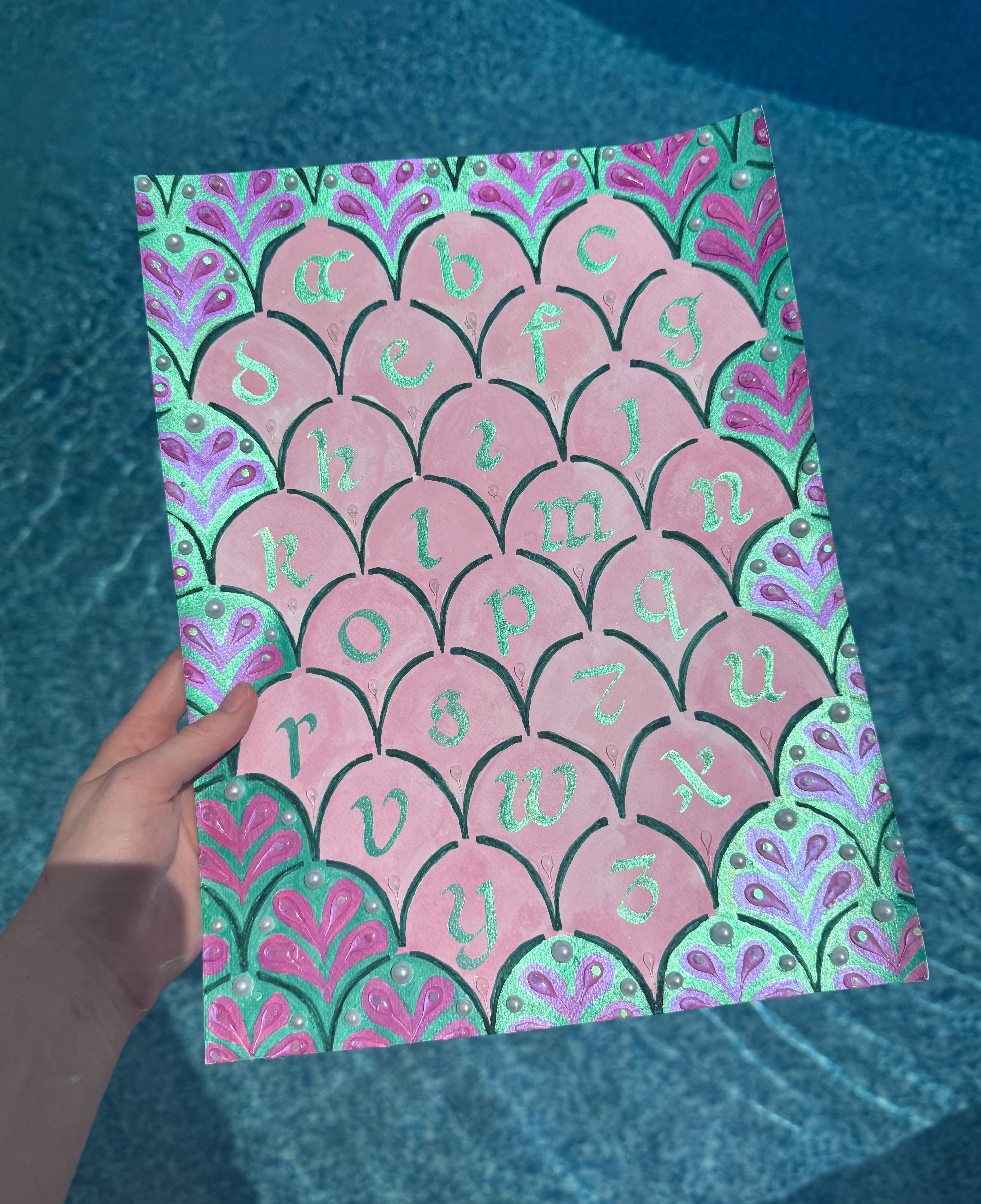 This calligraphic alphabet sampler uses Beneventan minuscule and mixed media techniques. Pencil was used for the initial sketch, gouache for a watercolor effect, and iridescent ink for shine. Pearl beads, hot glue, and chunky glitter were added to create water droplet textures and enhance the ocean-inspired theme.