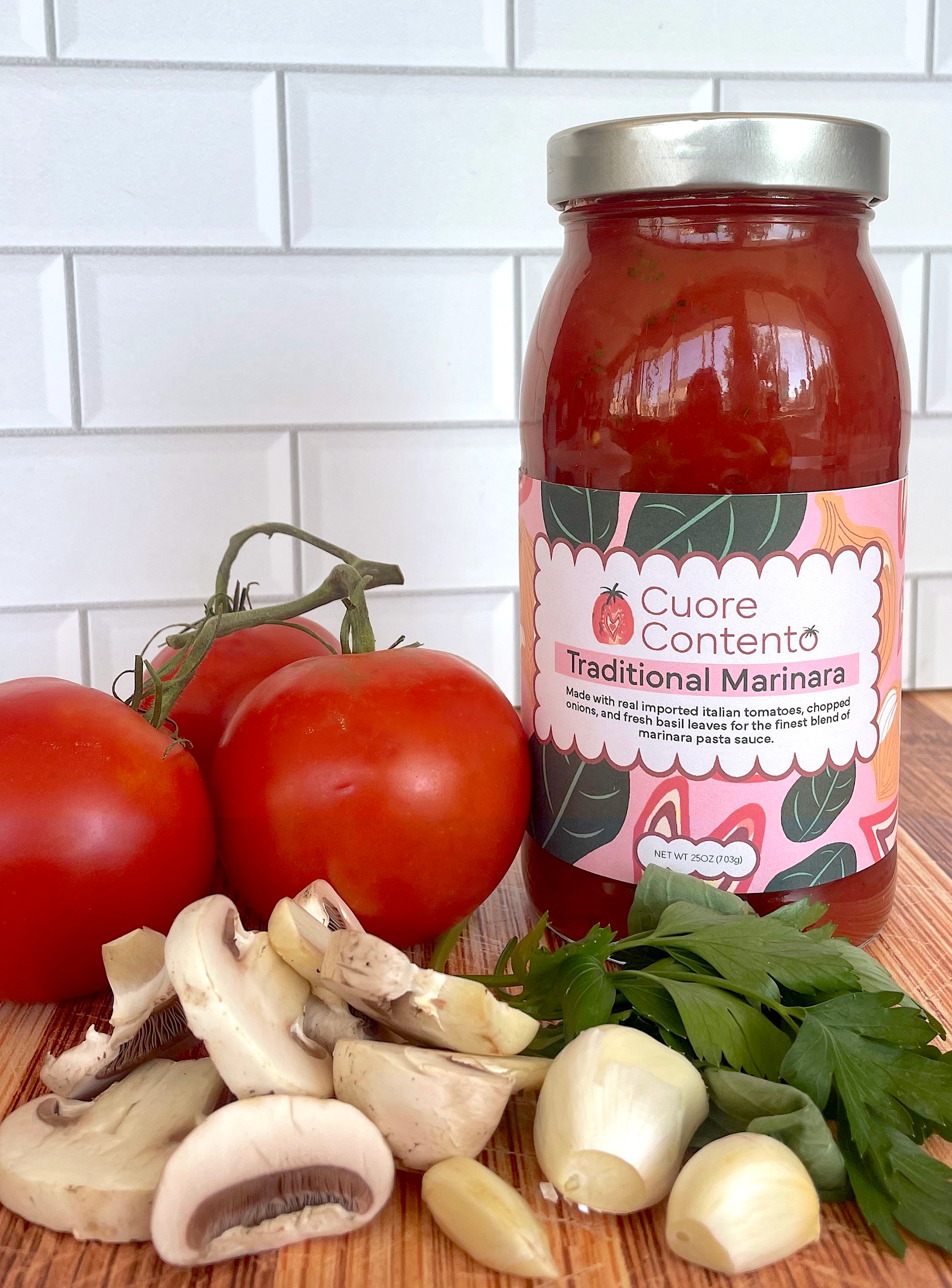 The restaurant, Cuore Contento (the contented heart), has a logo and brand they have used for decades. The owners, Vito and Rosa, with the shift to packaging, are looking to rebrand. They want to be known for their flavorful, vegetarian and hearty meat sauces and perfectly dried homemade pastas. When asked words that describe their sauces and pastas they said: warm, loving, flavorful, rich, colorful, satisfying, and to see some of my in-process work, scroll to the bottom of the page.