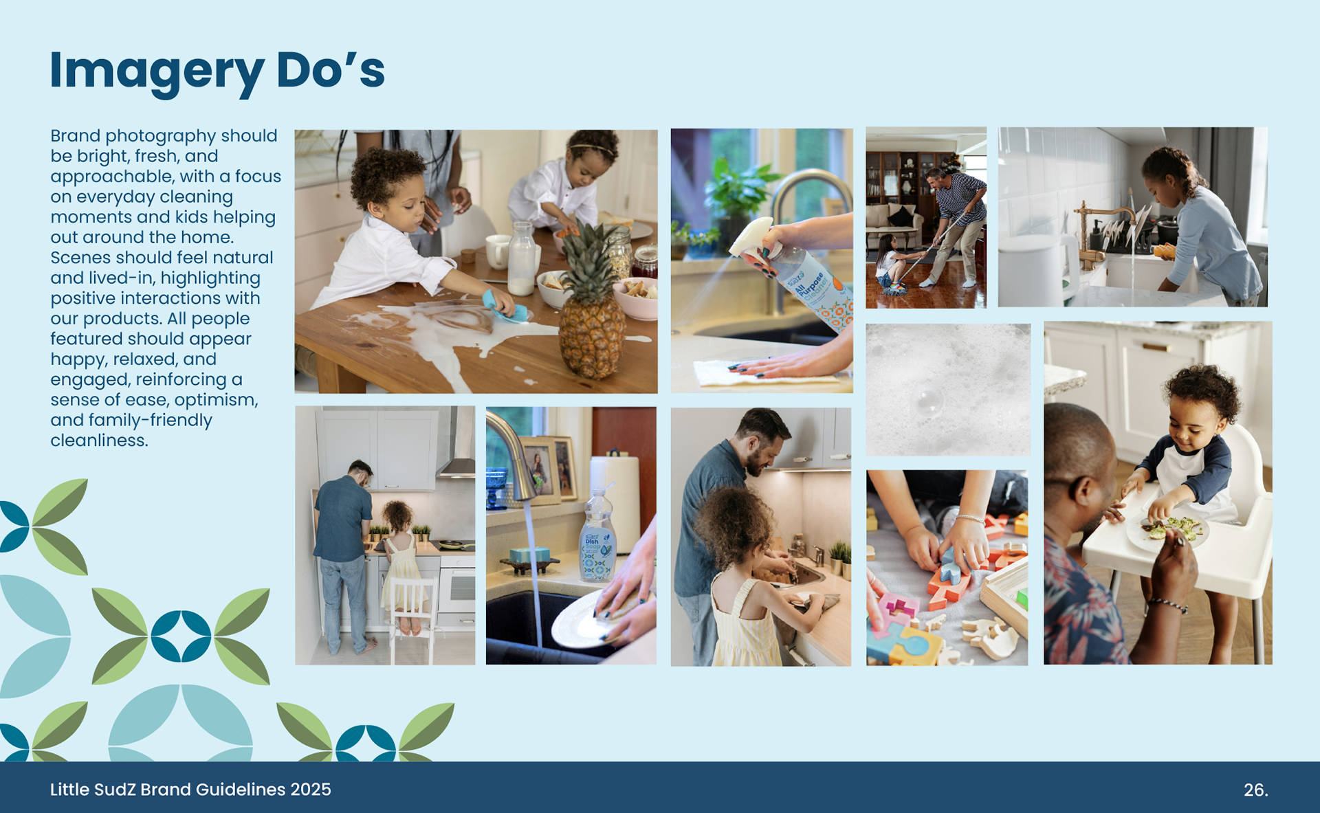 Create a cohesive, family-friendly brand system for Little SudZ that ensures consistency across all applications while reflecting the brand’s playful and approachable personality.