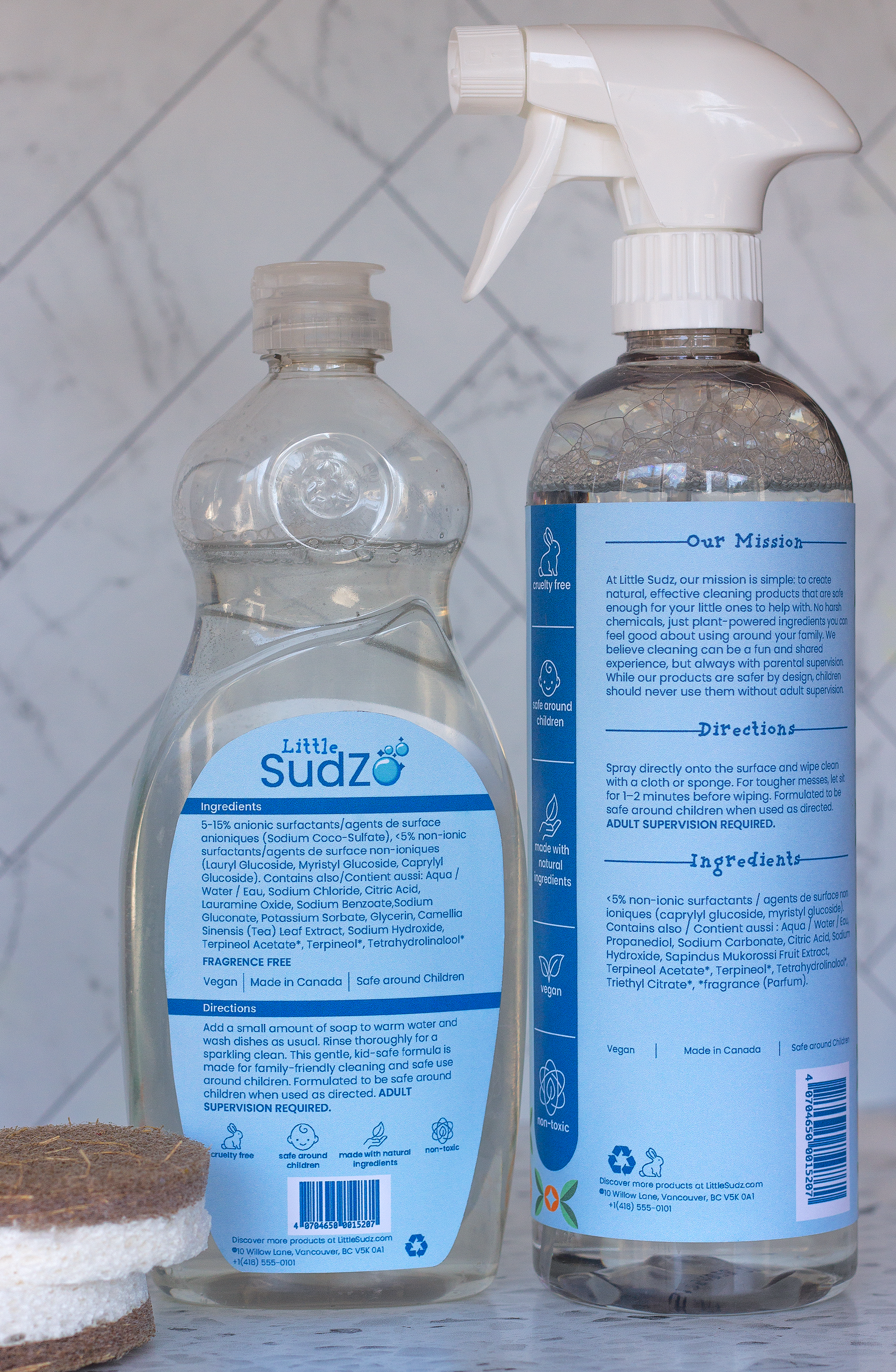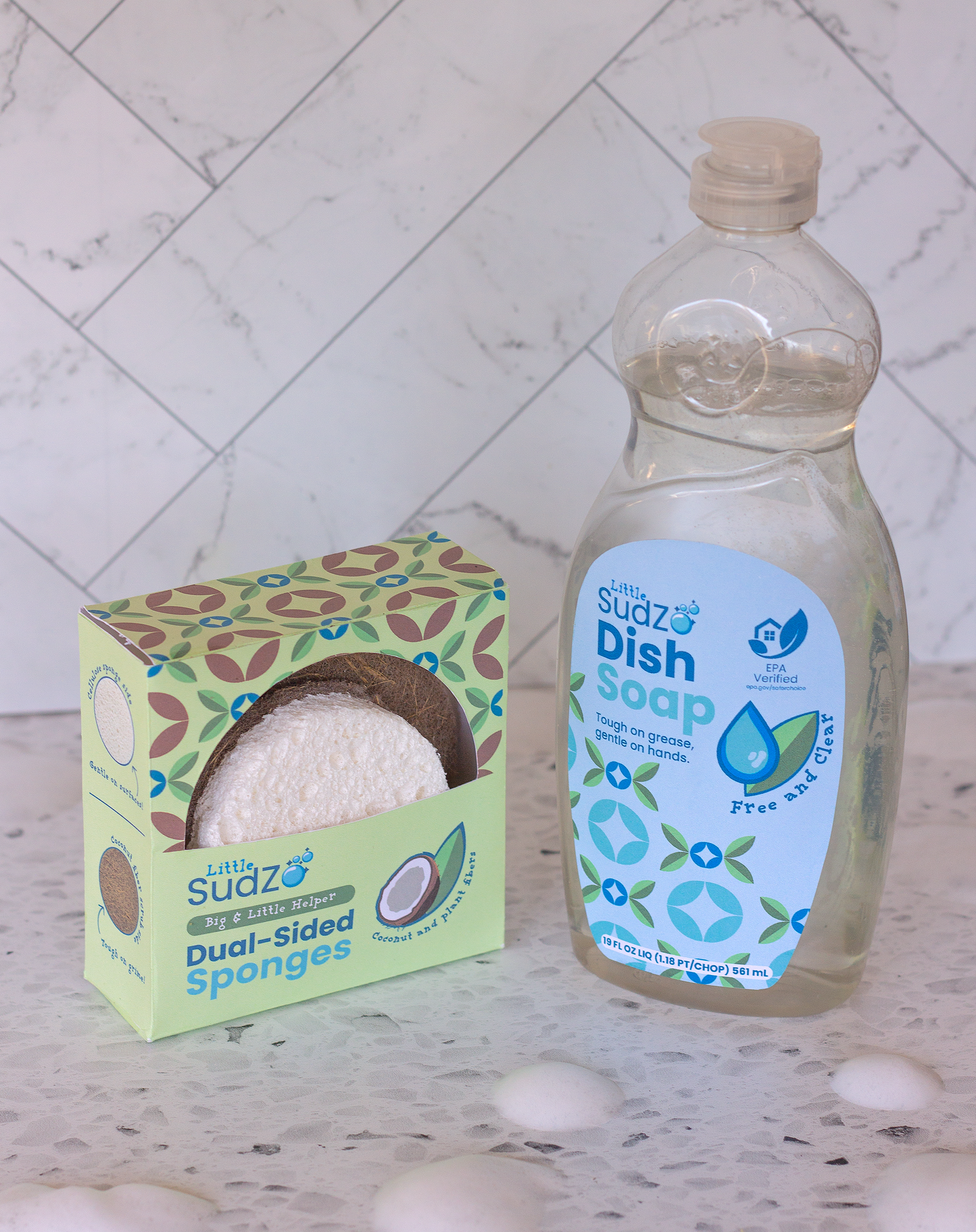 Little SudZ is a family-friendly cleaning brand. The packaging system includes all-purpose cleaner, dish soap, big and small coconut fiber sponges, compostable dish cloths, and bottle brushes in two sizes. The paired tools allow kids and adults to clean together while keeping a cohesive brand system. All photos were taken by me. To view the Little SudZ brand guidelines, click below.